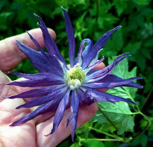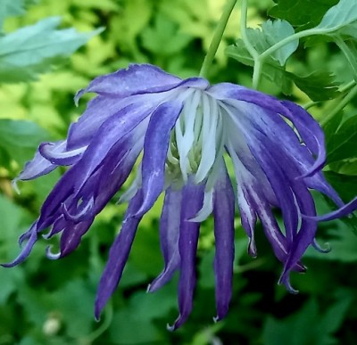 Квітки середні, махрові. Чашолистки світло синьо — фіолетові до основи білі. Стамінодії – вузькі, довгі, хвилясті, світло синьо — фіолетові.